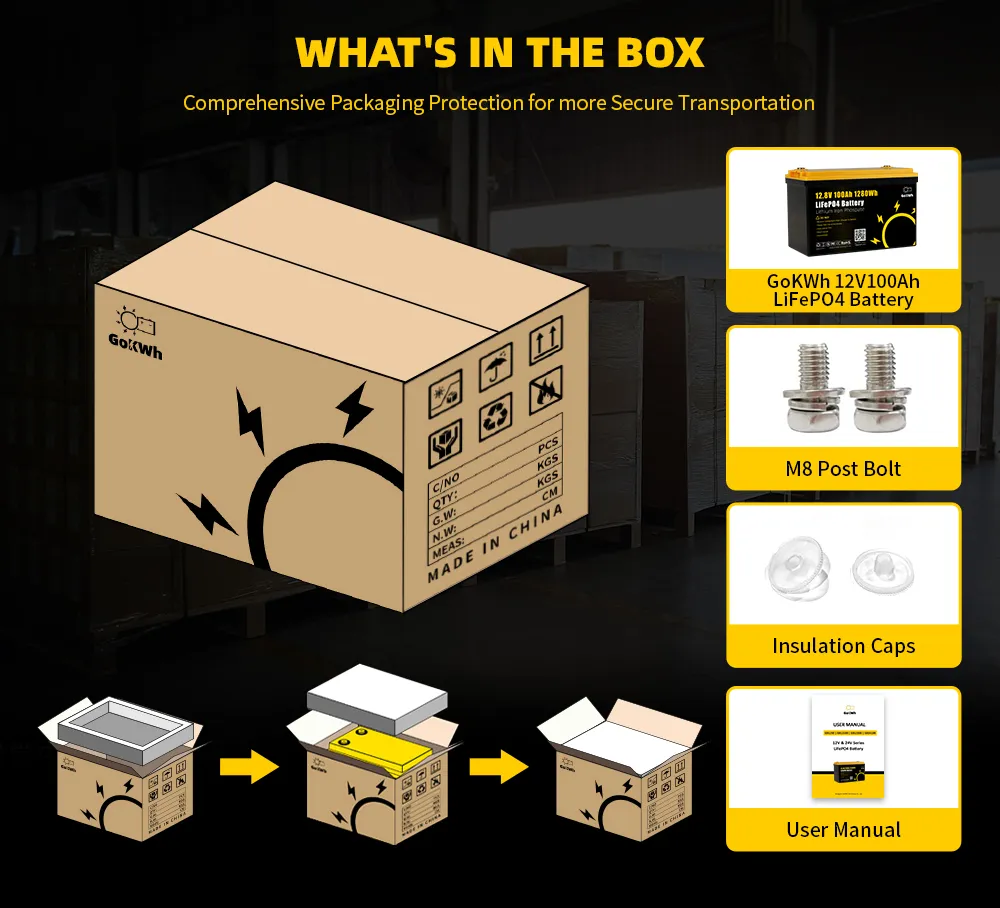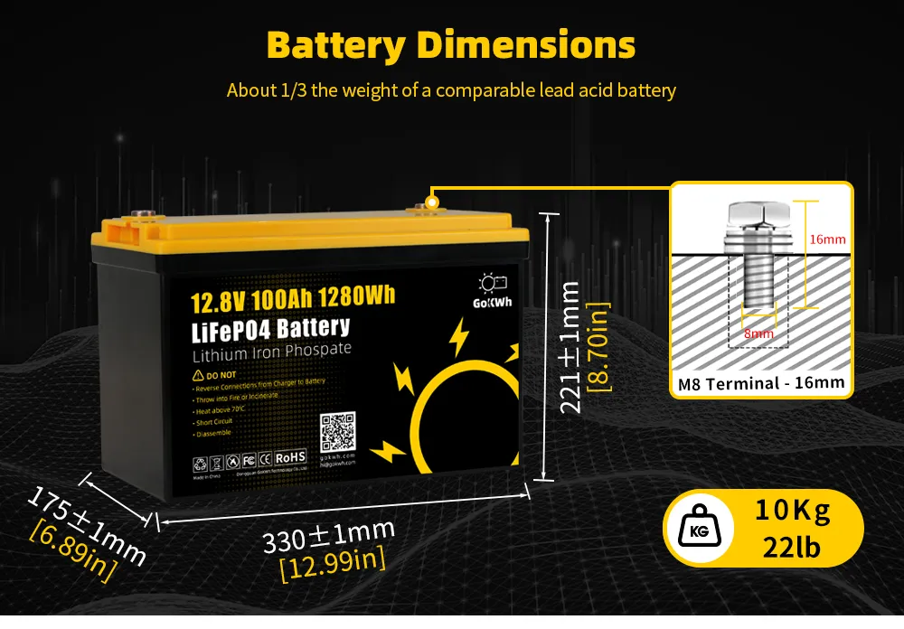 GoKWh 12V 100Ah LiFePO4 Battery with compact structure and IP65 waterproof rating, built-in BMS ensures 8000+ long cycles and safe operation.